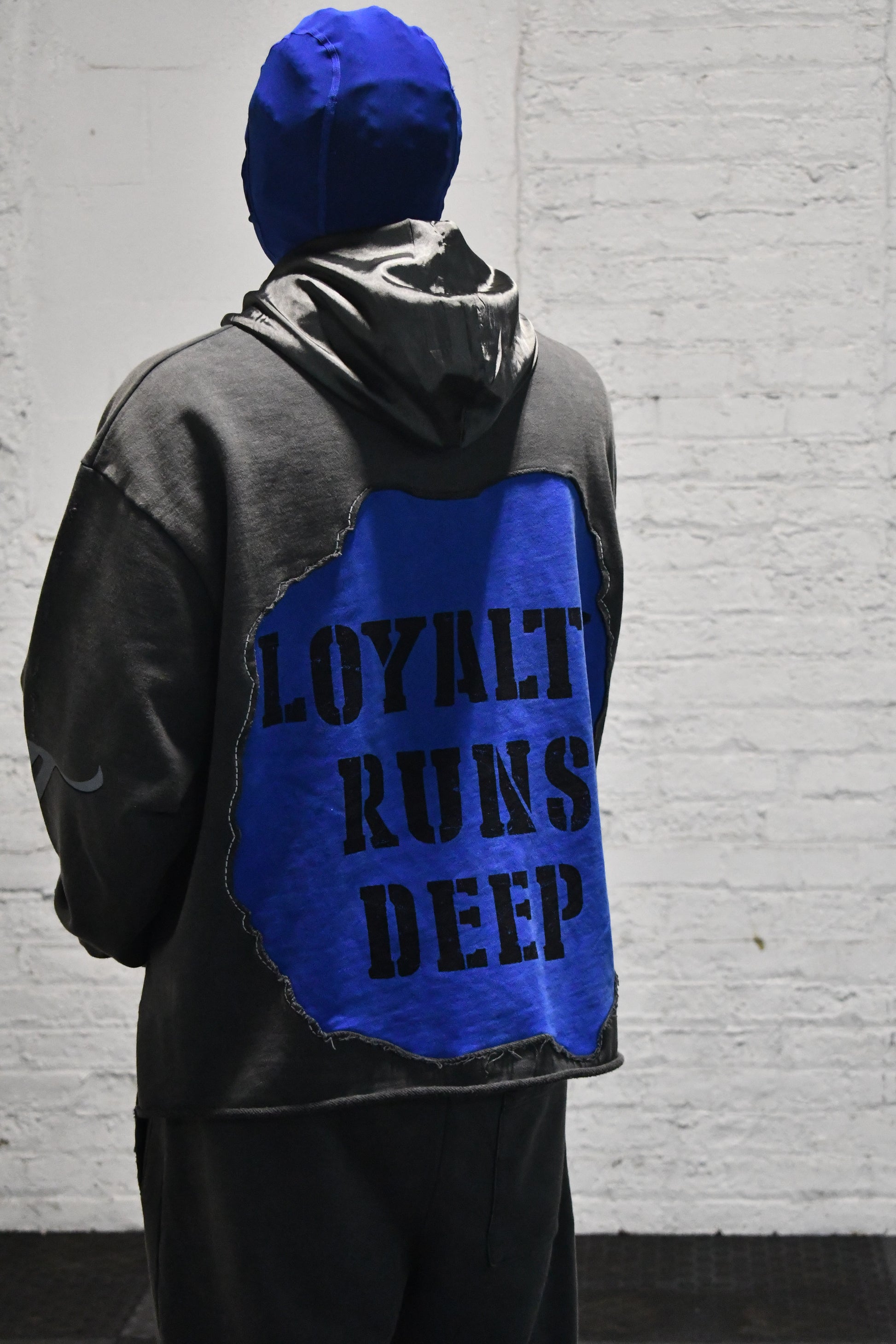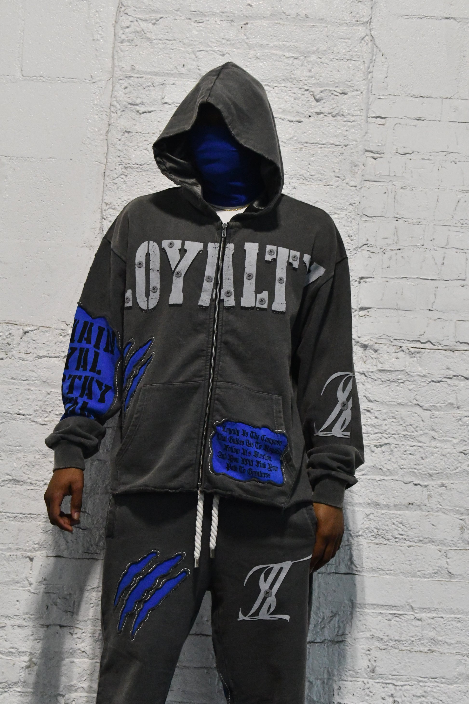 Heavyweight French Terry sweatsuit in washed grey with royal blue layered panel detailing and distressed patchwork finish.
